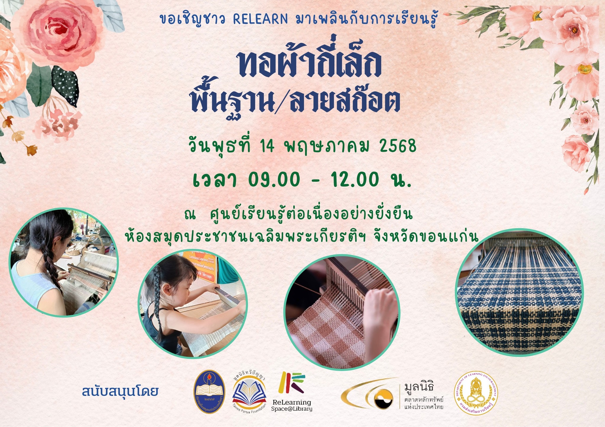 วันพุธที่ 14 พฤษภาคม 2568ศูนย์เรียนรู้ต่อเนื่องอย่างยั่งยืน ห้องสมุดประชาชนเฉลิมพระเกียรติฯ จังหวัดขอนแก่น เปิดอบรมหลักสูตร "ทอผ้ากี่เล็ก "